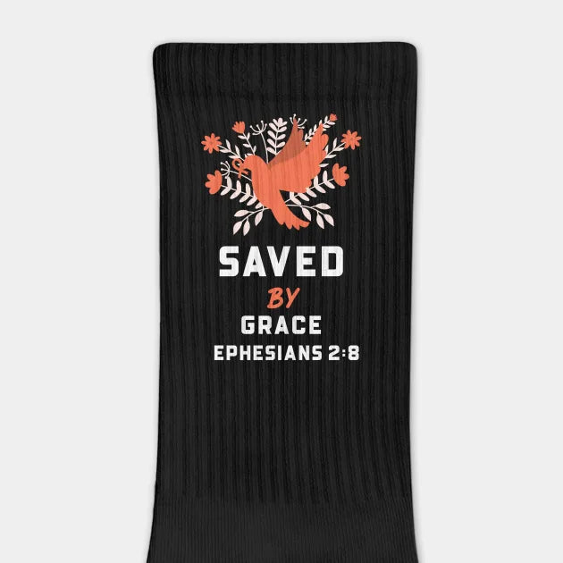 Saved by Grace Socks — Ephesians 2:8 Biblical Scripture Crew Socks, Christian Faith Message, Soft Everyday Comfort Gift for Believers